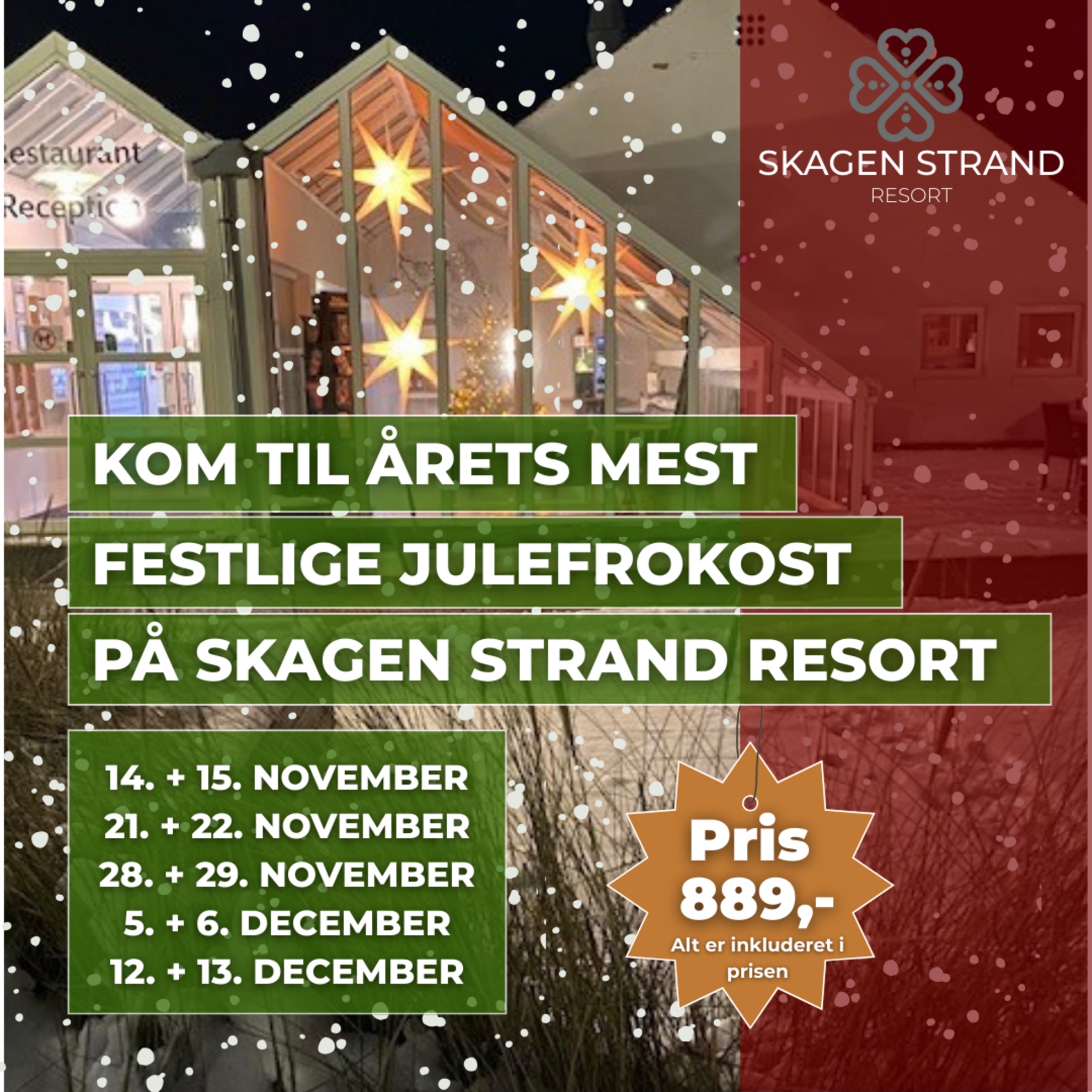 På Skagen Strand Resort byder vi på en overdådig julebuffet med alle julens traditionelle favoritter, fri bar og masser af stemning. Sammen med Anne Keller fra Flora Flora drysser vi julemagien ud over hele resortet – så rammerne emmer af hygge, varme og julefest.