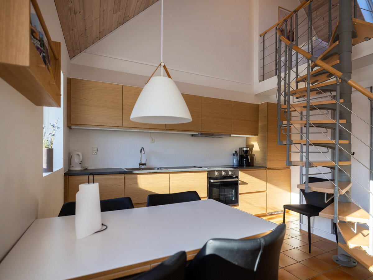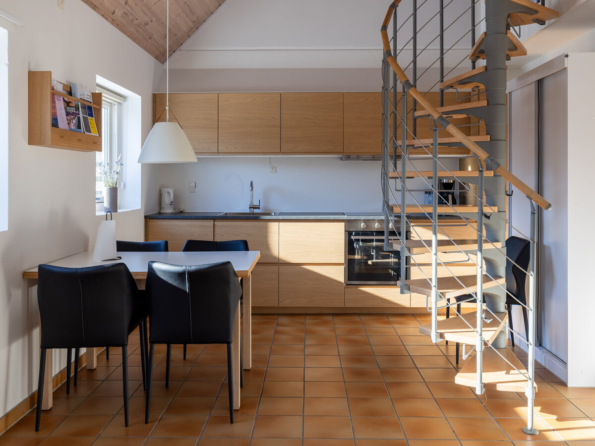 Den åbne 1. sal giver mulighed for at trække sig lidt tilbage, samtidig med at man fortsat føler sig som en del af fællesskabet i huset.